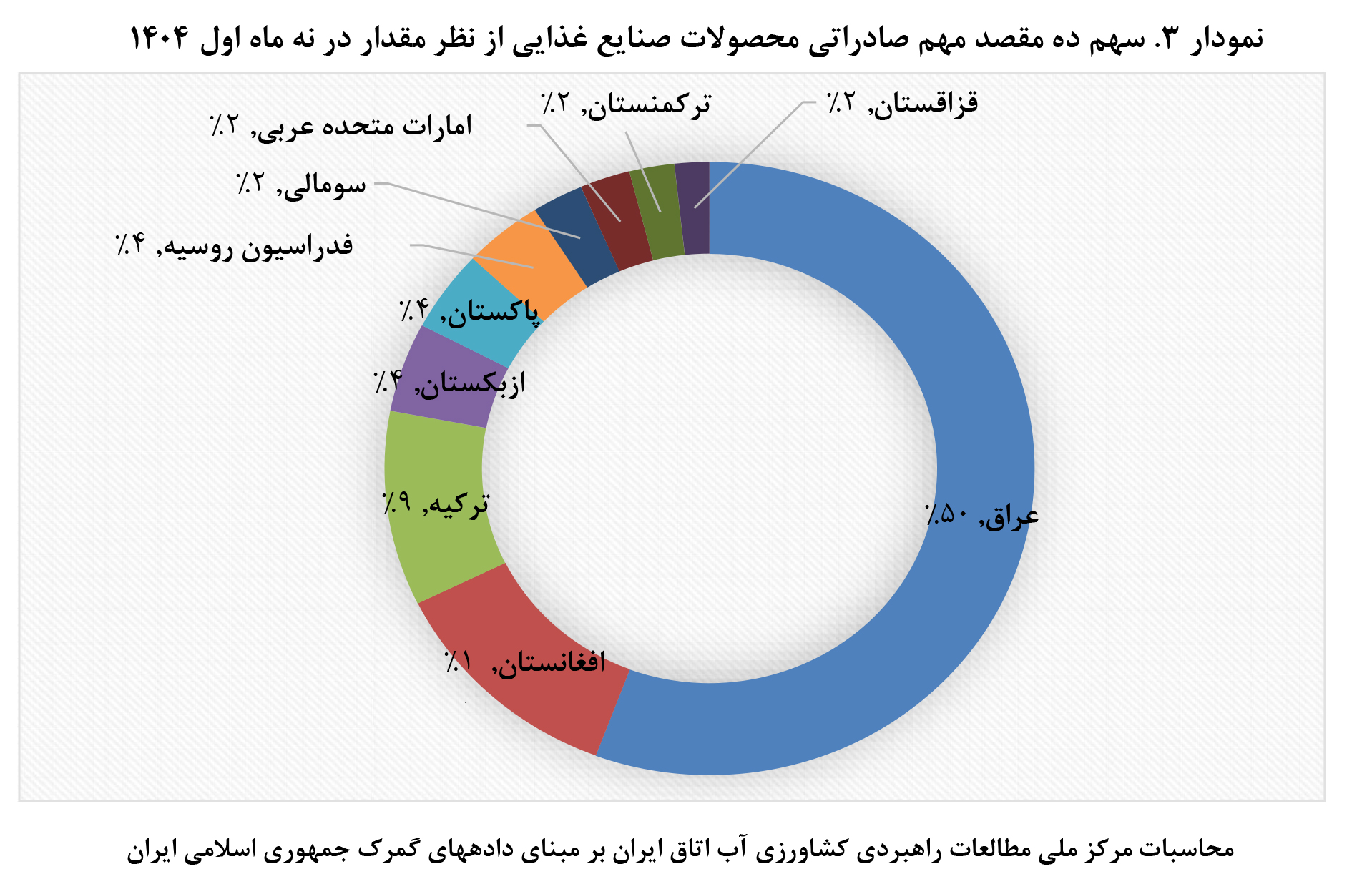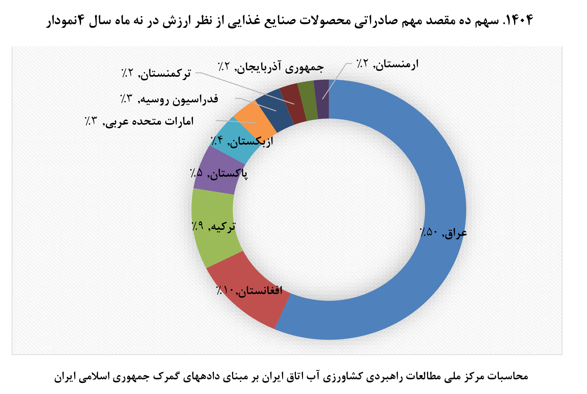 بررسی مقاصد صادراتی نشان میدهد عراق با سهم ۵۰ درصدی از نظر وزن و ارزش، همچنان مهمترین خریدار محصولات صنایع غذایی ایران است. پس از عراق، کشورهای افغانستان با سهم ۱۱ درصدی (از نظر وزنی) و ۱۰ درصدی (از نظر ارزشی)، ترکیه با سهم ۹ درصدی، ازبکستان و پاکستان با سهم ۴ تا ۵ درصدی در رتبه های بعدی جای گرفته اند.