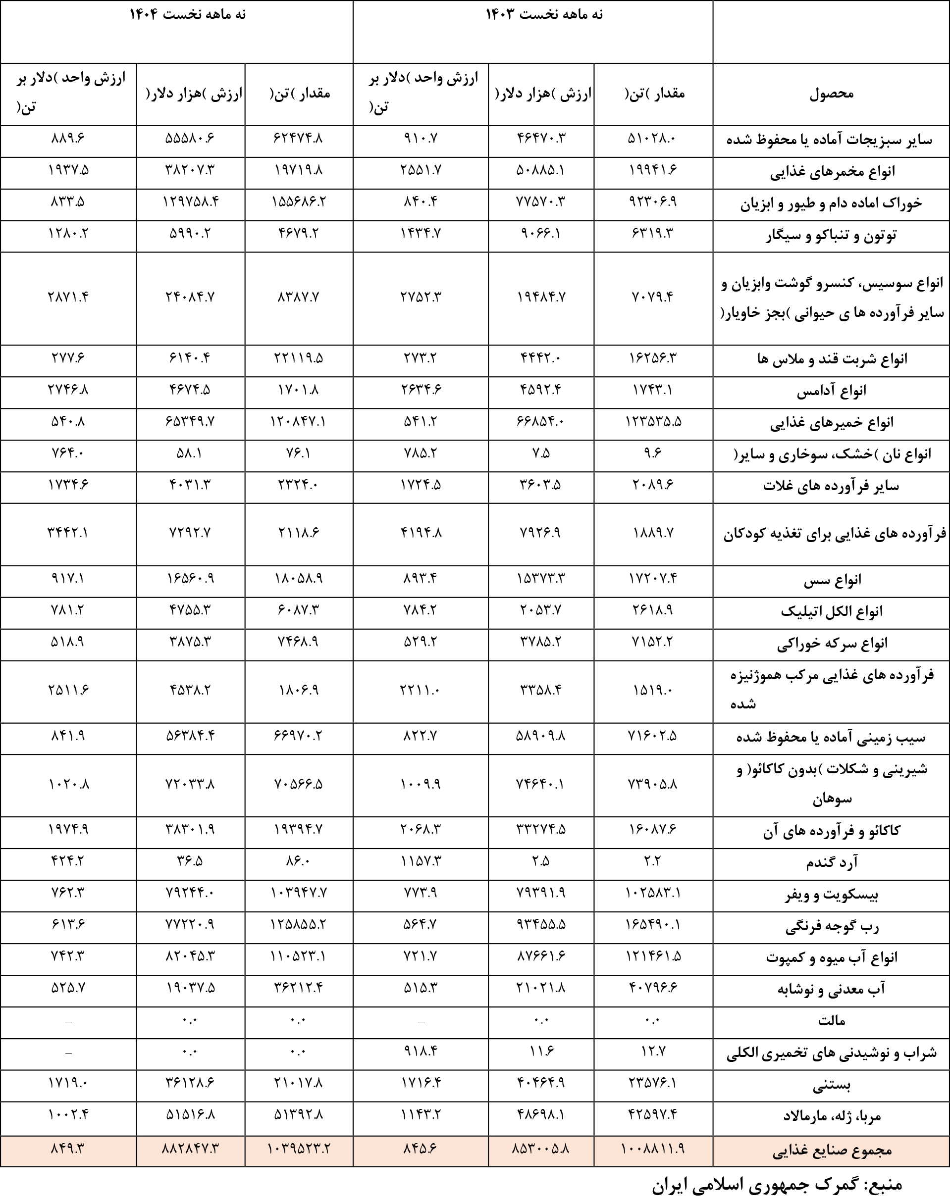 صادرات محصولات صنابع غذایی در نه ماهه نخست سال 1403 و 1404