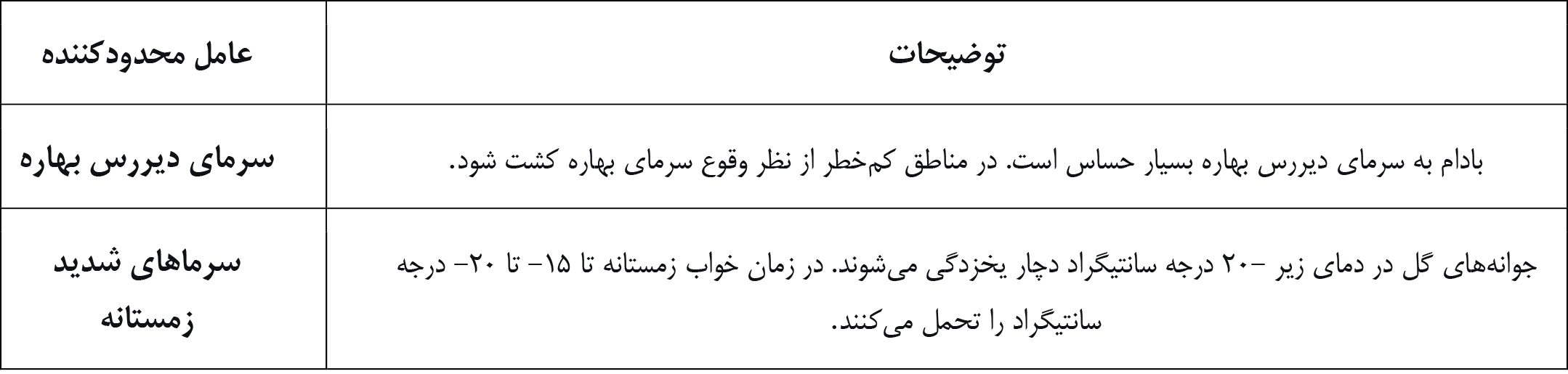 – نیاز گرمایی: برای شکوفایی جوانههای گل پس از تأمین نیاز سرمایی