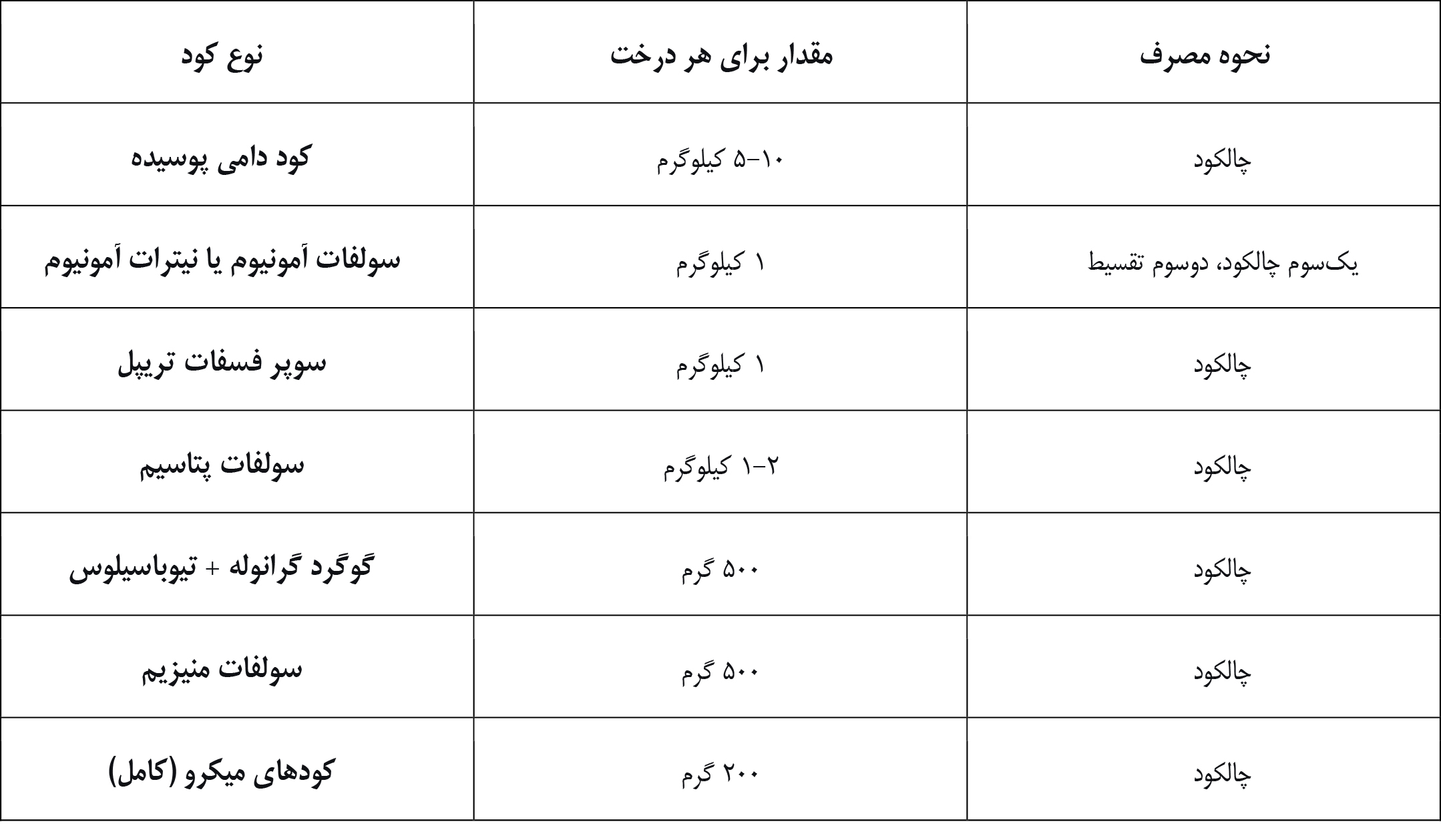 ۶.۳ توصیه کودی برای درختان بارده (هر دو سال یکبار)