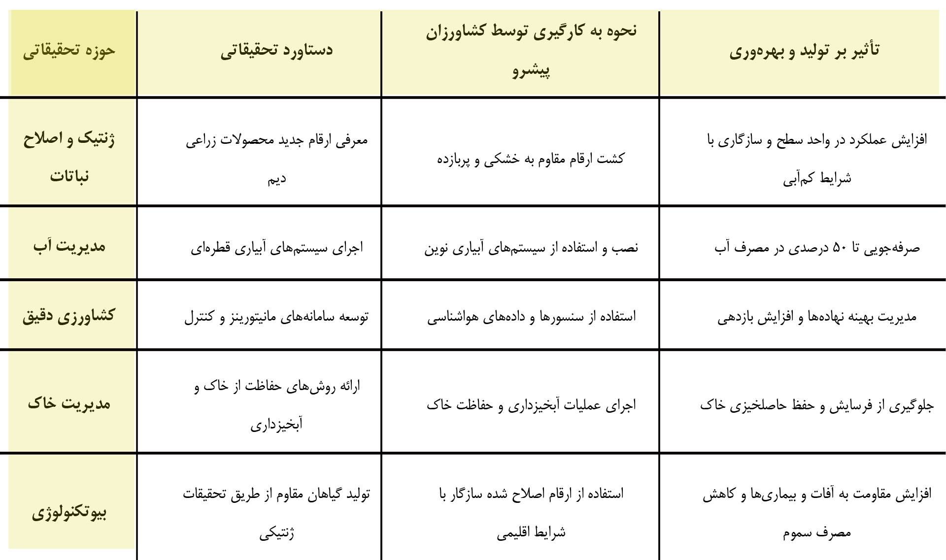 جدول نمونه‌هایی از دستاوردهای تحقیقاتی و کاربرد آنها توسط کشاورزان پیشرو