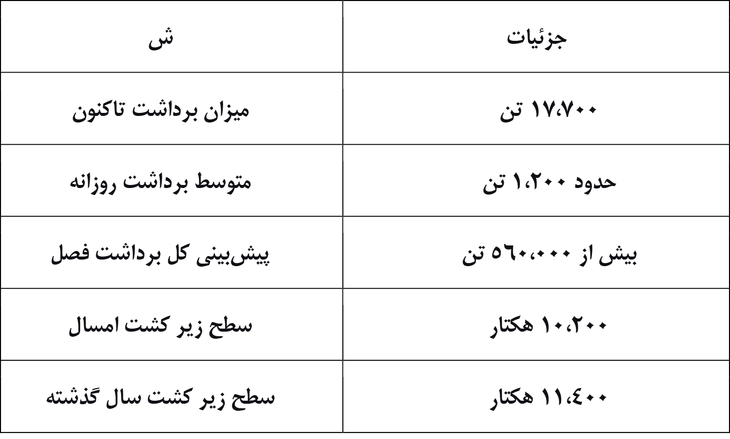 اگرچه سطح زیر کشت امسال به دلیل اجرای طرح الگوی کشت و ملاحظات مربوط به مدیریت منابع آبی کاهش یافته، اما پیشبینی میشود مجموع تولید با اتکا به ارقام پربازده و روشهای نوین کشت در سطح بالایی قرار گیرد .